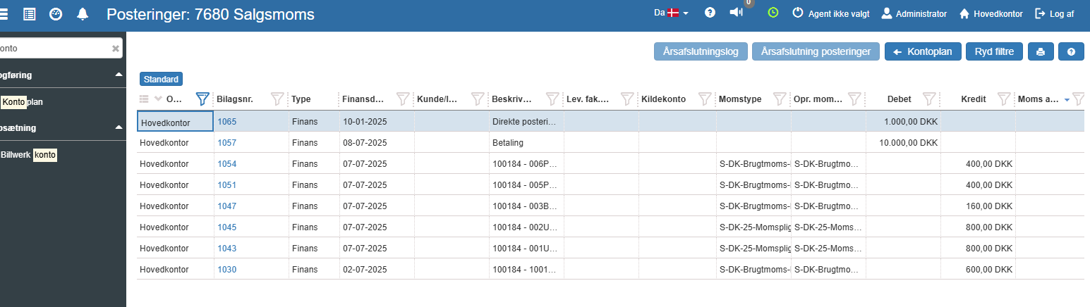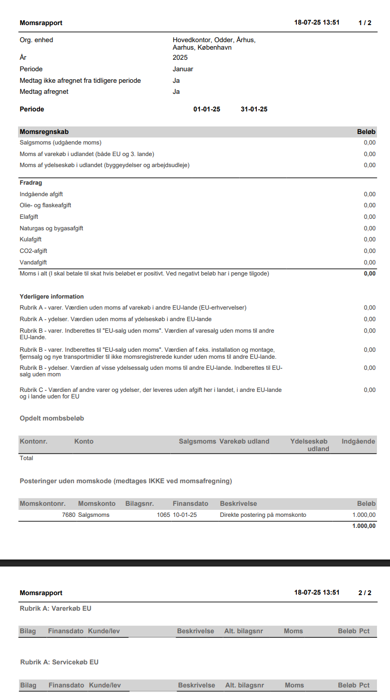 Sektionen “Posteringer uden momskode” (medtages IKKE ved momsafregning) vil herefter se således ud