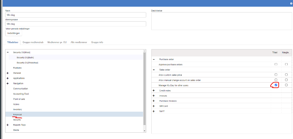 Hvis kunden skal benytte ”Min Dag” i Sapera skal der gives adgang til menupunktet "Min Dag" på lagergruppen (Grupper → Lagerstyring → Navigation → Financial navigation → My Day)
