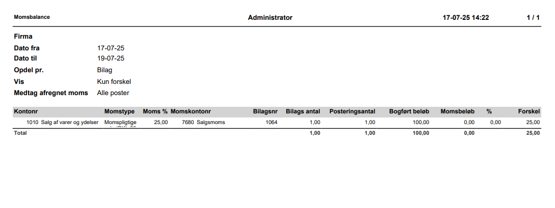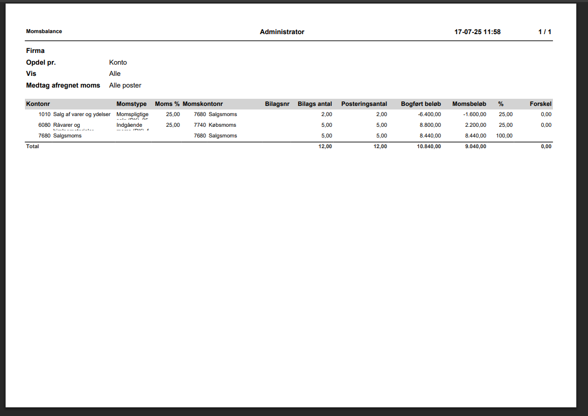 Kun forskel: kun konti med difference mellem forventet og faktisk momsbeløb vises.