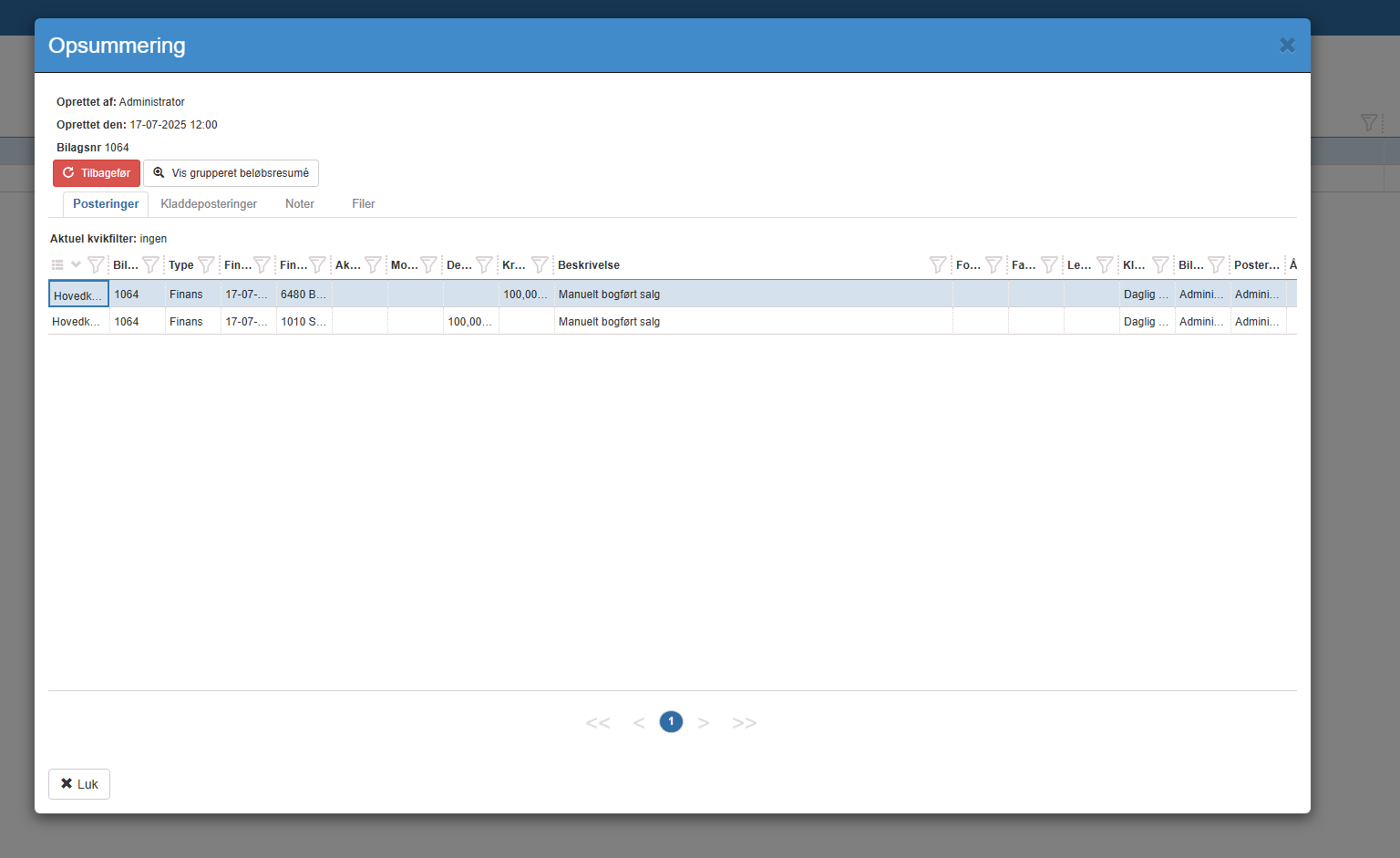 Vi kan her se, at vi manglede at sætte momstype på det manuelt bogførte salg. Vi kan nu eventuelt tilbageføre bilaget og bogføre det korrekt.