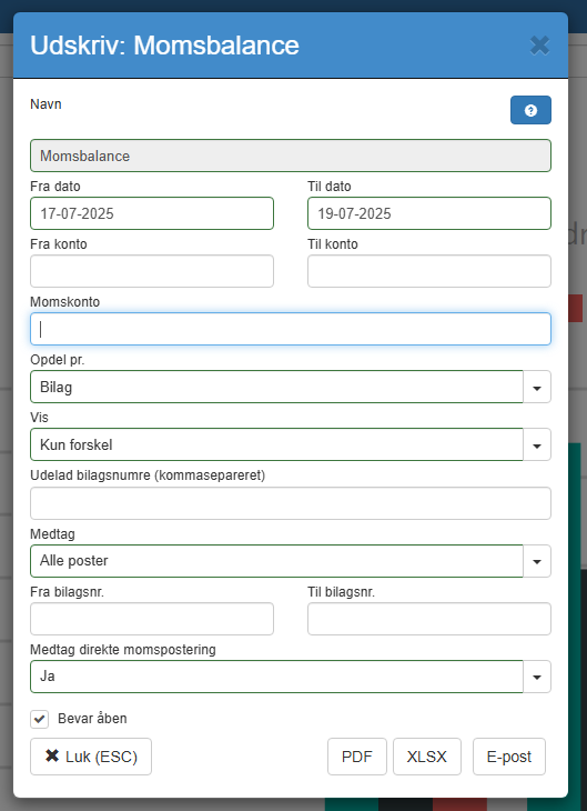 Hvis du ønsker at afgrænse til en bestemt momskonto (f.eks. udgående moms), kan du angive det relevante momskontonummer i feltet “Momskonto”.