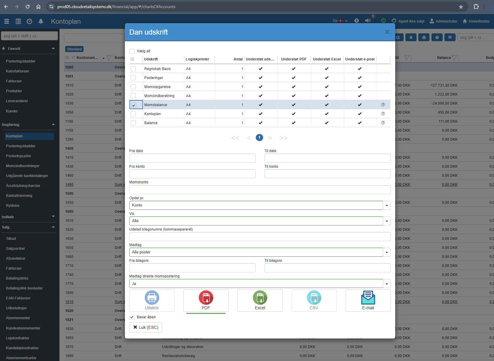 Udskriften kan genereres som PDF, Excel eller sendes som vedhæftning pr. e-post. Se udskriftsdialog.