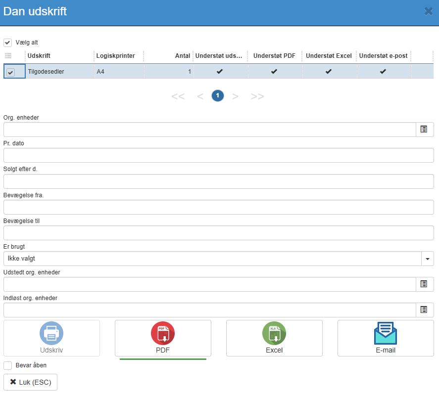 Her vælges de organisatoriske enheder, som udskriften skal omfatte. Hvis der vælges flere enheder, medtages tilgodesedler fra alle de valgte enheder.