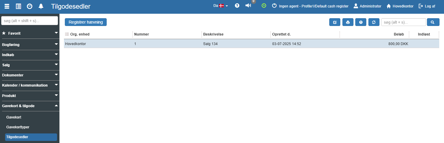 1. Fra Shop Manager tilgås "Gavekort og tilgode"→ "Tilgodesedler".