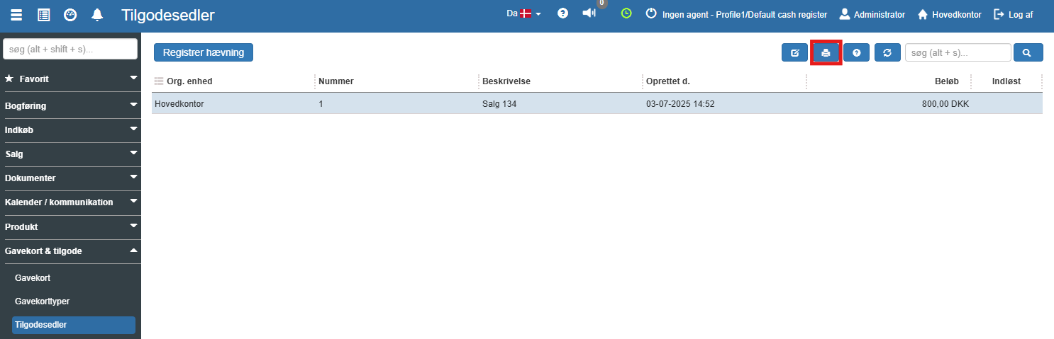 2. Fra Tilgode-siden, kan du trykke på printerikonet i øverste højre hjørne: