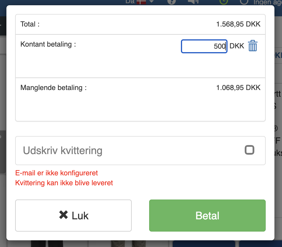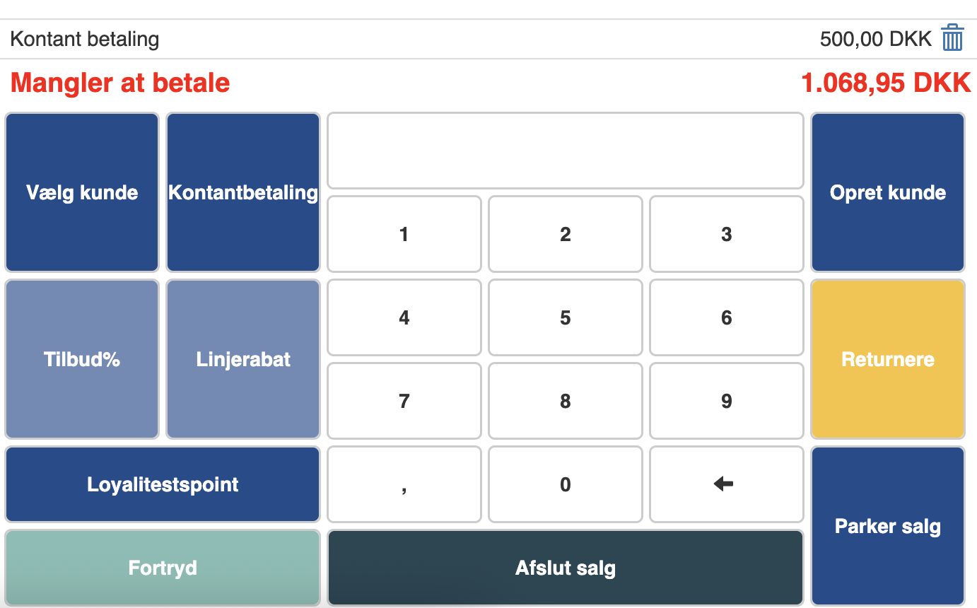 Hvis kunden ønsker at opdele sin betaling, så de betaler en del i kontanter og en anden del på anden vis, skal du først klikke på “Kontantbetaling”.