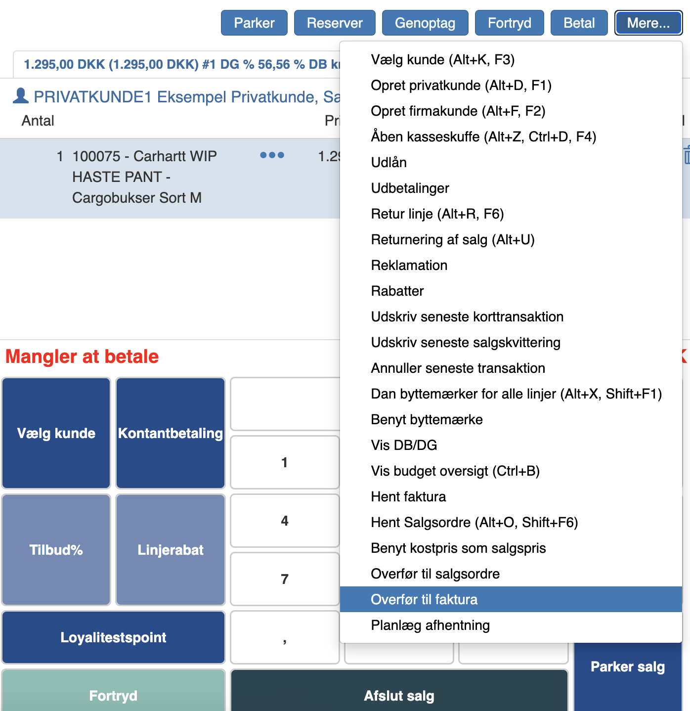 For at overføre det til en faktura, skal du klikke på “Mere” og derefter på “Overfør til faktura”