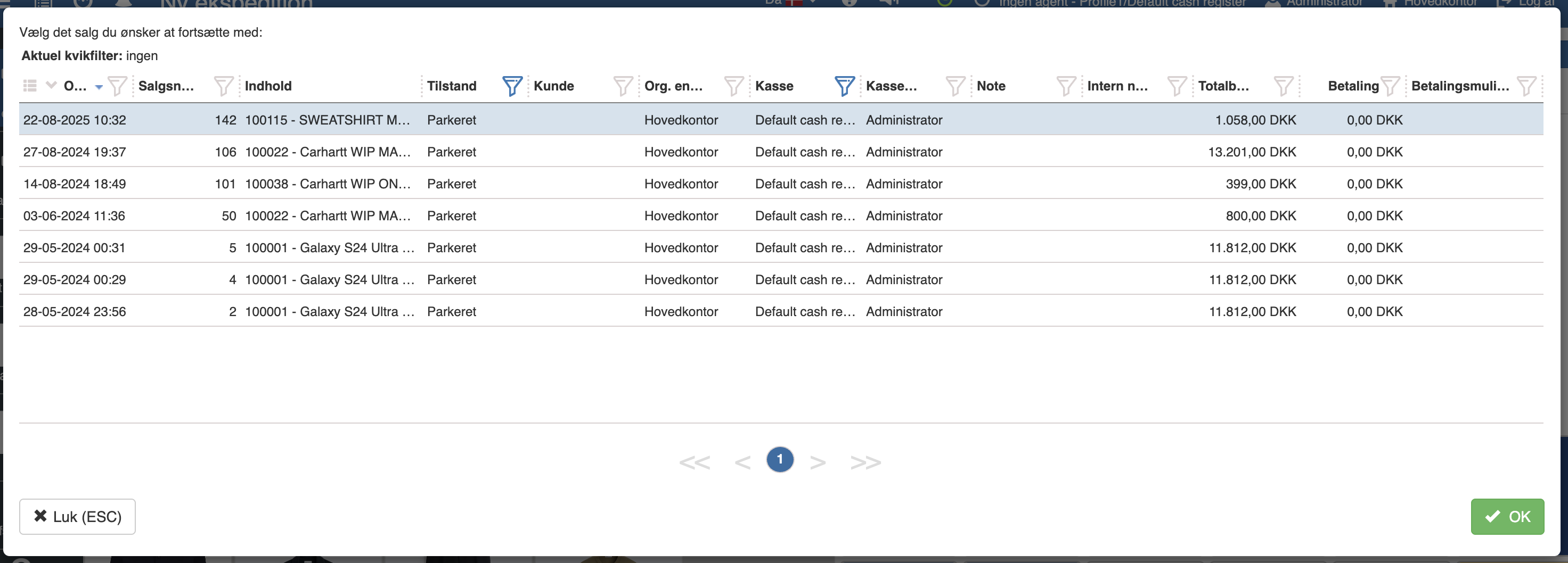 Når du så skal hente salget ned igen, skal du klikke på “Genoptag” og vælge den ekspedition, du var igang med, hvorefter du klikker “OK”