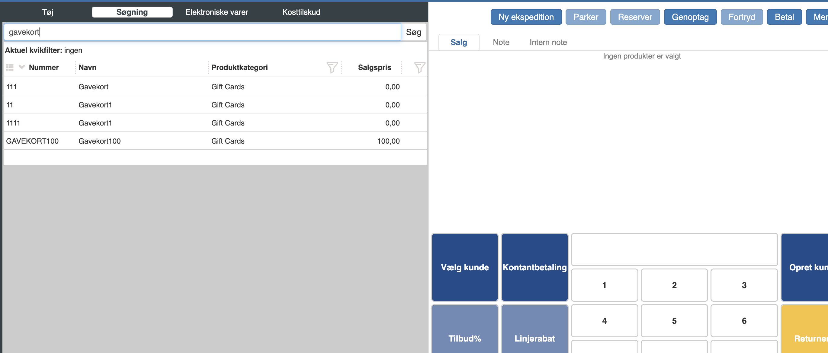Hvis du vil sælge et gavekort, skal du søge det frem i venstre side under fanen “Søgning”