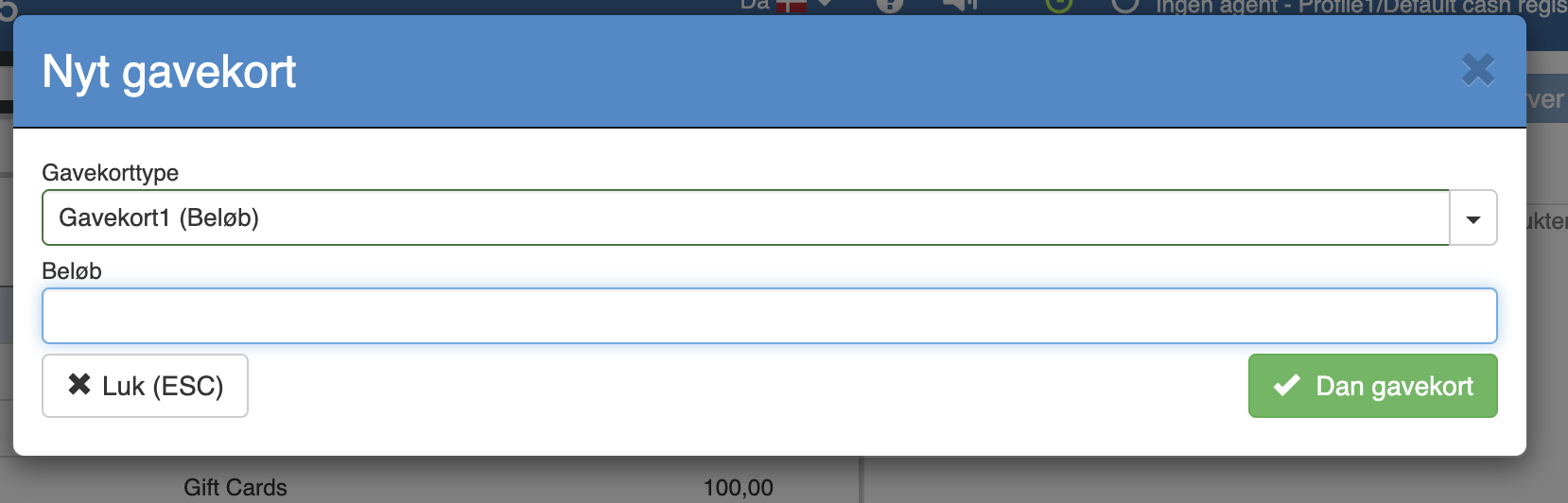 Klik på gavekortet og indtast beløbet, det skal indeholde. Klik på “Dan gavekort”