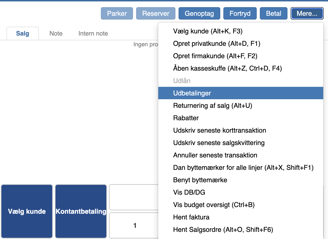 Hvis man vil lave en udbetaling på kassen - tager nogle penge fra kassen der skal bruges til en udgift, skal du klikke på “Mere” og derefter på “Udbetalinger”