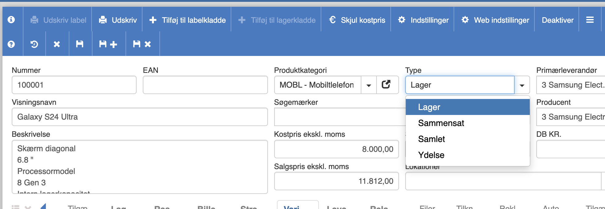 Der findes flere forskellige typer af varer, som kan vælges når du opretter eller retter et produkt.