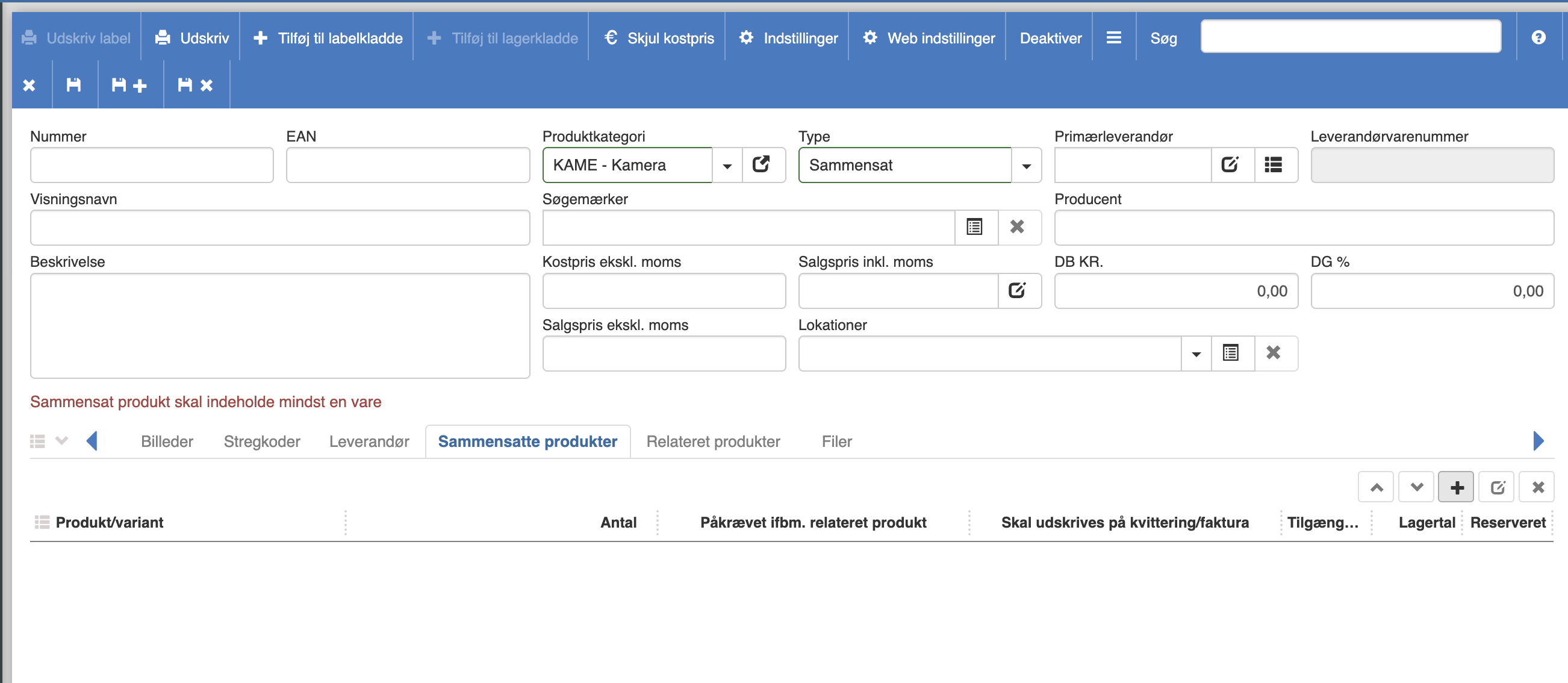 Hvis man sætter en vare som en sammensat vare, kan man tilføje nogle produkter nede i fanen “Sammensatte produkter” ved at klikke på “+”