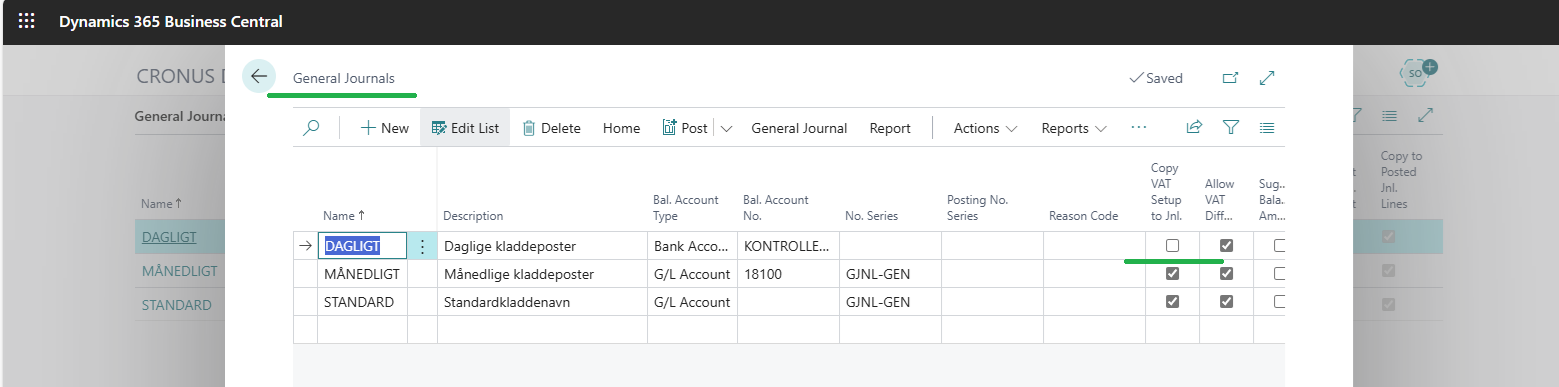 Sørg for, at checkboxen [Copy VAT Setup to Jnl. Lines] ikke er markeret.