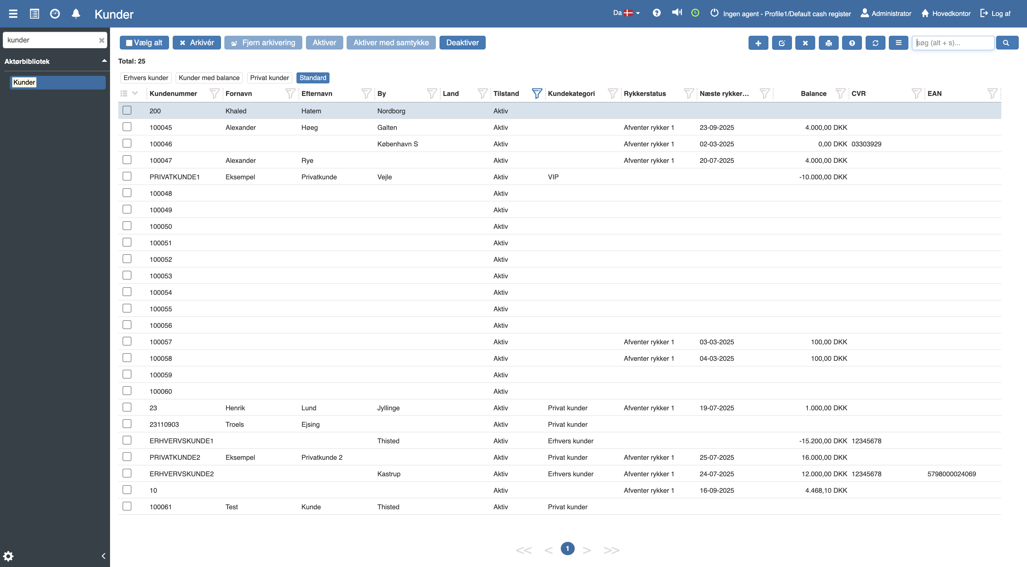 Ønsker du at tilgå en salgsordre, kan dette nemt gøres ved at åbne hamburger menuen i venstre hjørne og tryk på “Shopmanager”. Derefter søger du på “Kunder”, som hører under “Aktørbibliotek” og vil blive ført til en oversigt af alle dine eksisterende kunder.