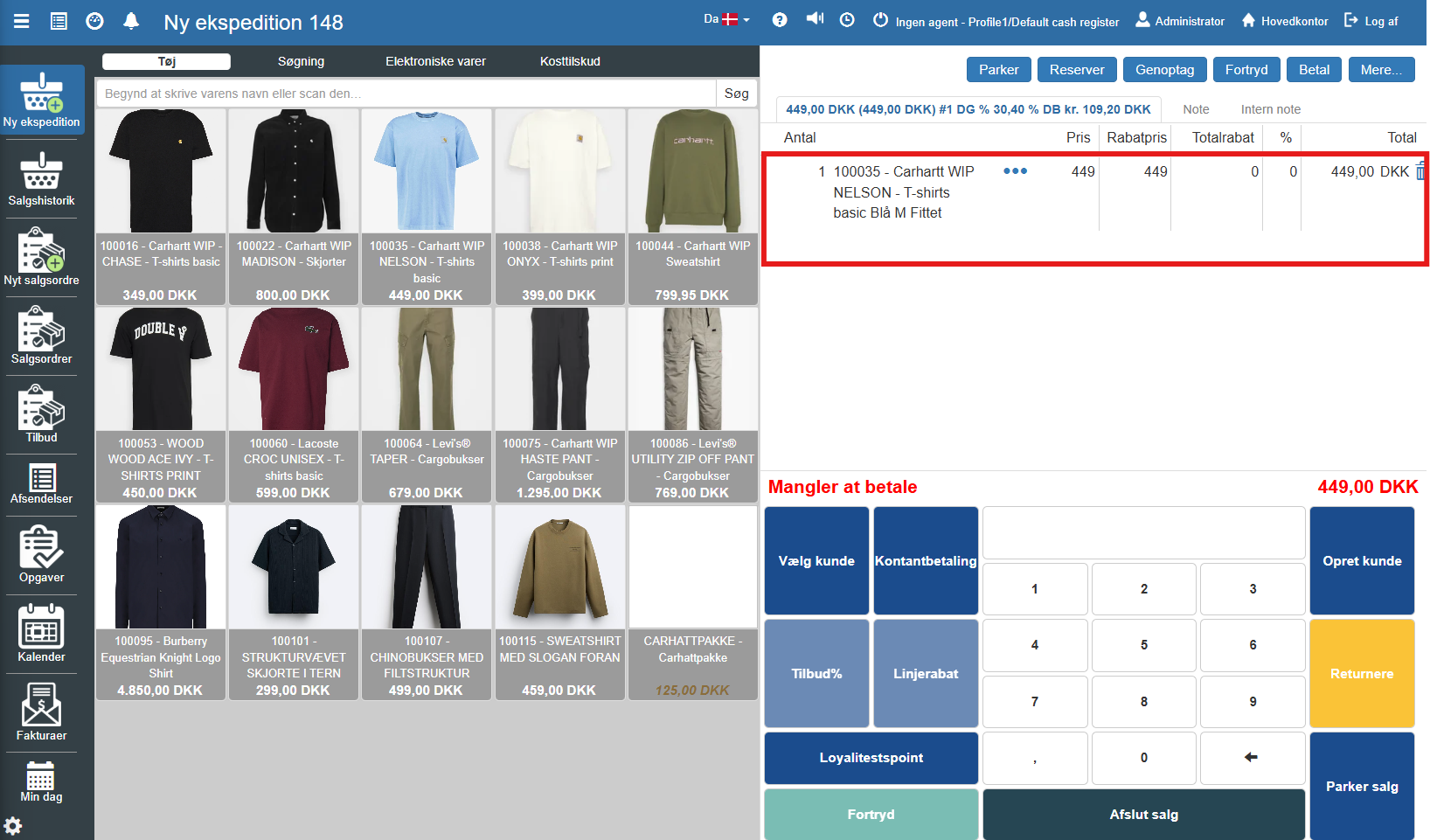 Når samtlige varer er registreret, afsluttes ekspeditionen via betalingspanelet nederst til højre:
