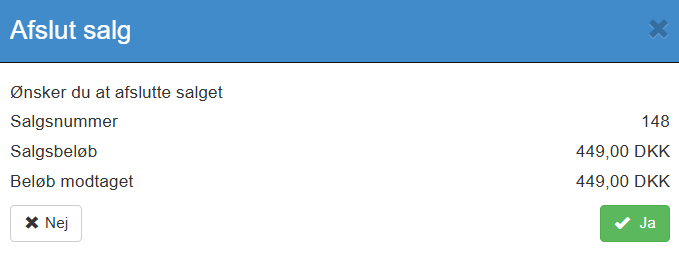 Efter gennemført betaling vil skal du godkende afsluttelse salg. Kassen vil herefter nulstilles og være klar til næste ekspedition.