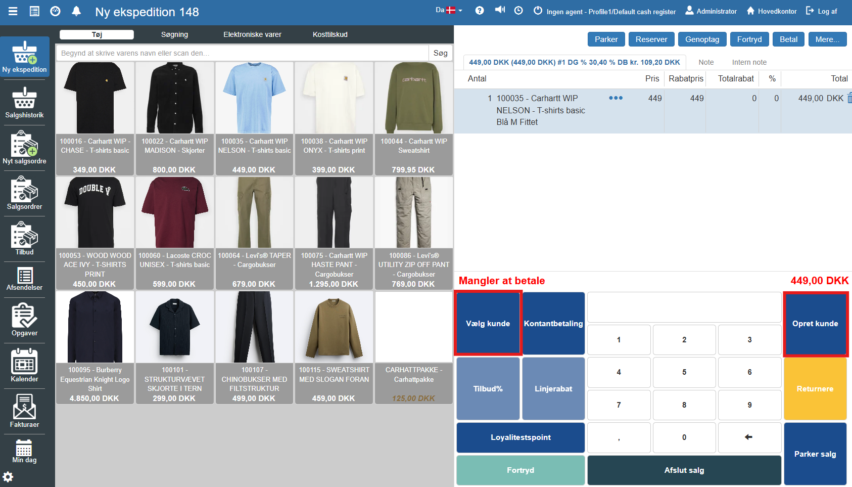 Hvis salget skal registreres på en specifik kunde, anvendes knappen Vælg kunde i det blå funktionspanel. Er kunden ikke oprettet i systemet, kan dette gøres via knappen Opret kunde.