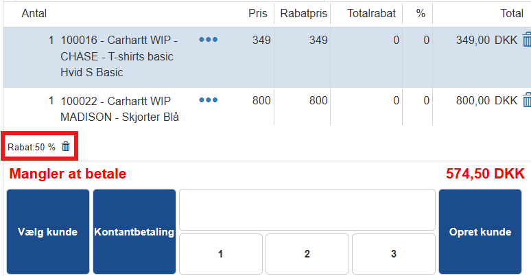 Rabatten vil herefter fremgå direkte på linjen, og varens totalpris opdateres.
