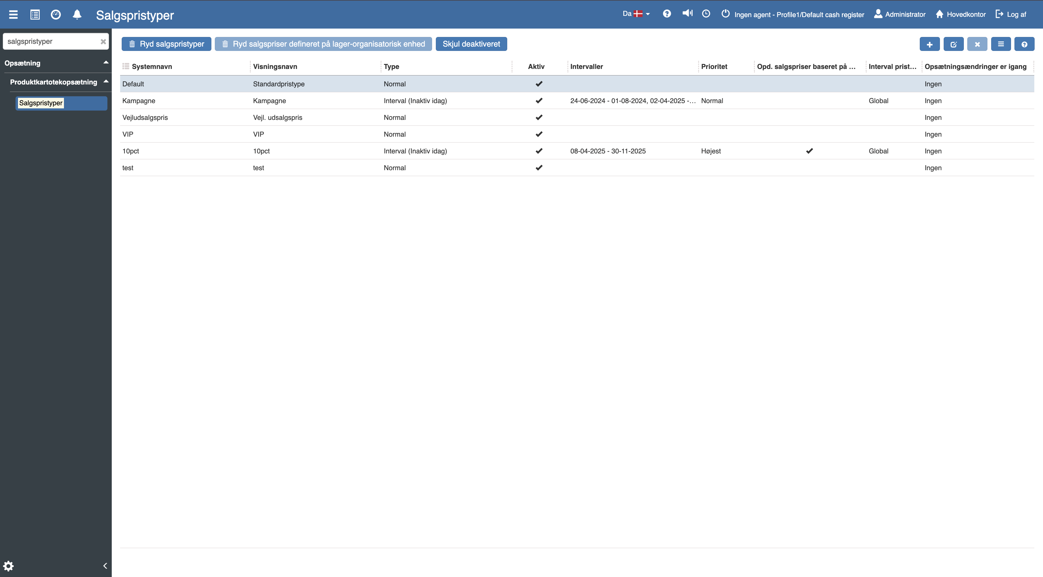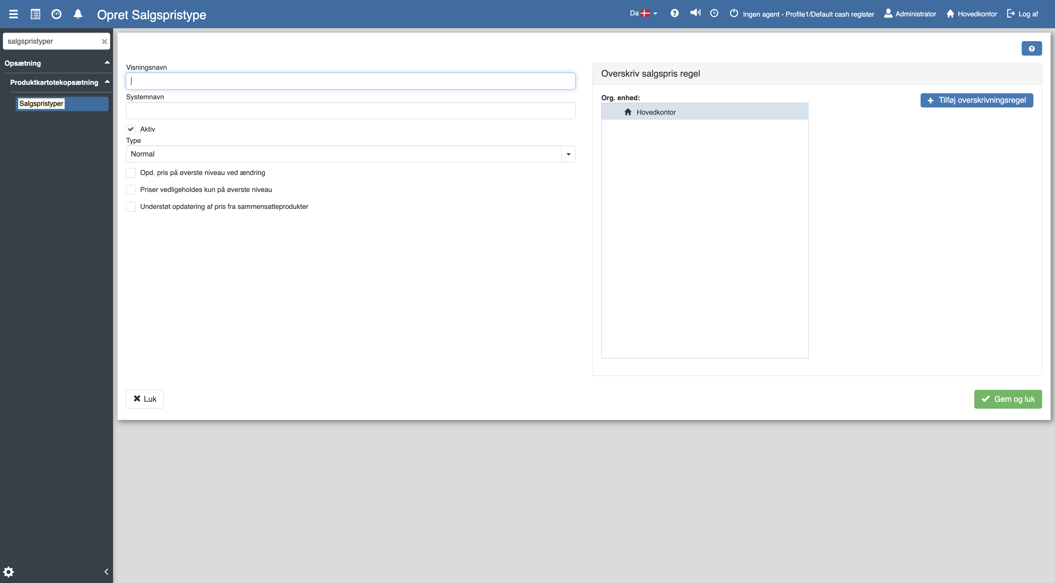 Hvis salgspristypen skal bruges, så husk at krydse feltet af, hvor der står “Aktiv”.