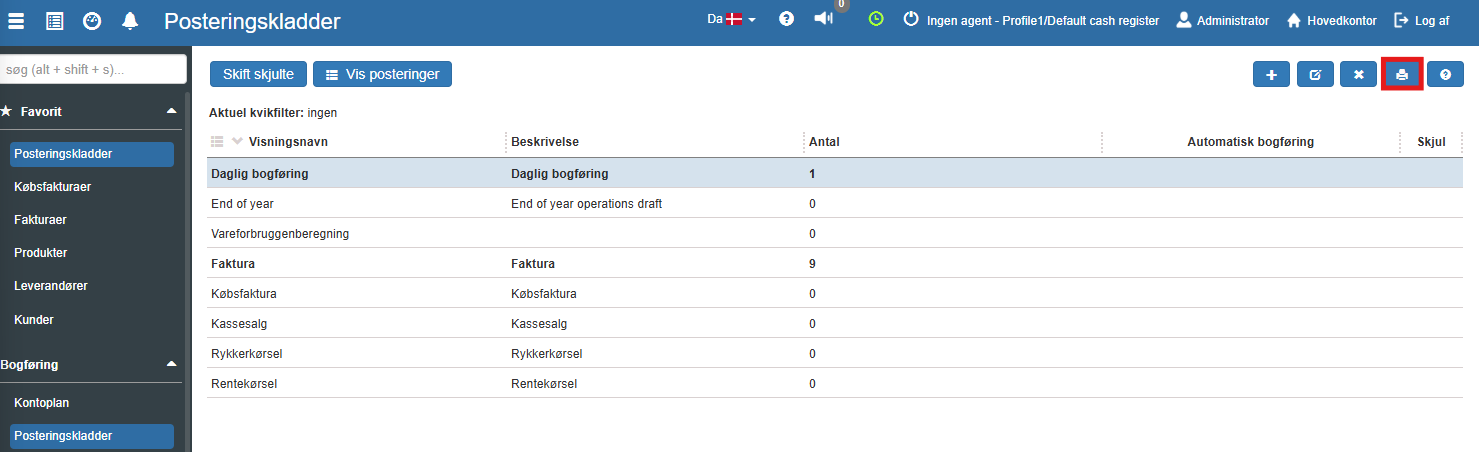 2. Fra Posteringskladder-siden, kan du trykke på printerikonet i øverste højre hjørne.