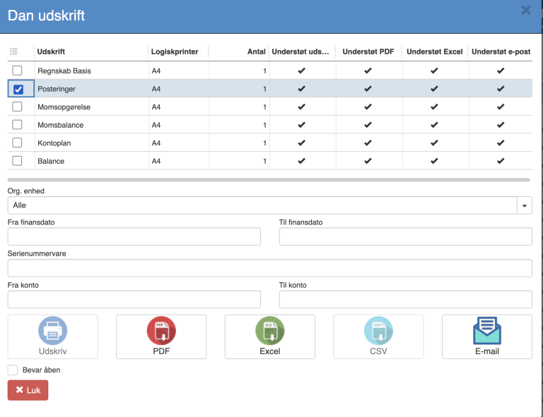 Udskriften kan generes som PDF, Excel eller sendes som vedhæftning pr. e-post. Se udskriftsdialog.