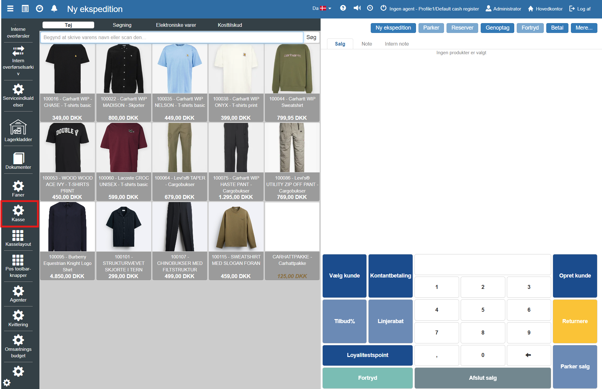 Modulet “Kasse” anvendes til at administrere virksomhedens fysiske eller digitale kasseterminaler. Det er her, man definerer de enkelte kasser, der skal være tilgængelige for medarbejderne i salgsøjeblikket.