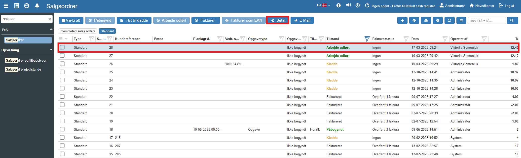 Når en salgsordre er færdigbehandlet og har fået tilstanden "Påbegyndt" og “Arbejde udført”, behøver du ikke navigere over i finans- eller kassemodulet for at registrere betalingen. Du har mulighed for at gøre det direkte fra selve ordren, hvilket sparer tid og holder processen samlet.