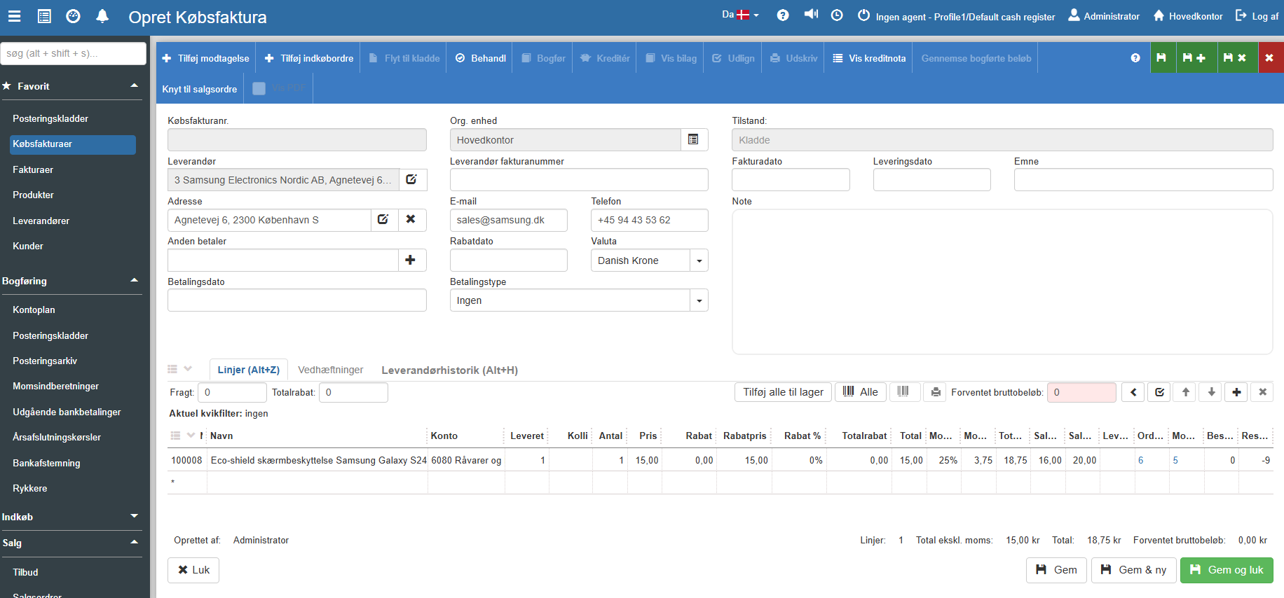 4. Afslut ved at klikke Gem og luk for at gemme den som kladde, eller klik på Bogfør i topmenuen for at låse og bogføre fakturaen i dit regnskab.