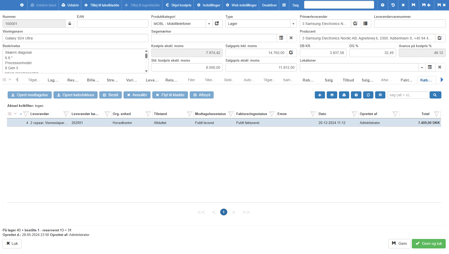 Tip: Helt nede i venstre hjørne af skærmen vil Sapera altid vise dig en lynhurtig udregning af varens samlede status, for eksempel: "På lager 43 + bestilte 1 - reserveret 13 = 31".