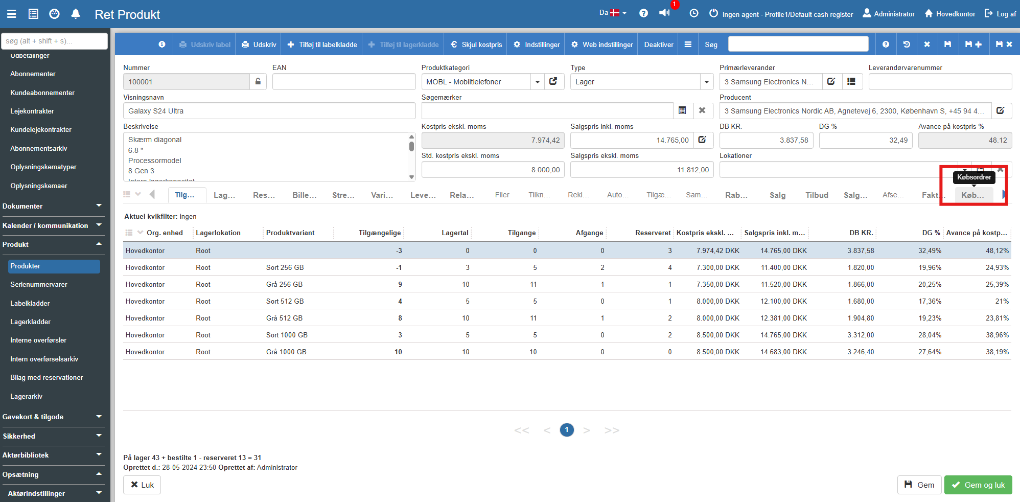 Når du arbejder med et specifikt produkt i Sapera, behøver du ikke navigere rundt i hele systemet for at finde ud af, om varen er bestilt hjem, eller hvor mange der reelt ligger på hylden. Du har lynhurtig adgang til det hele direkte fra produktets egne faner i bunden af skærmen.
