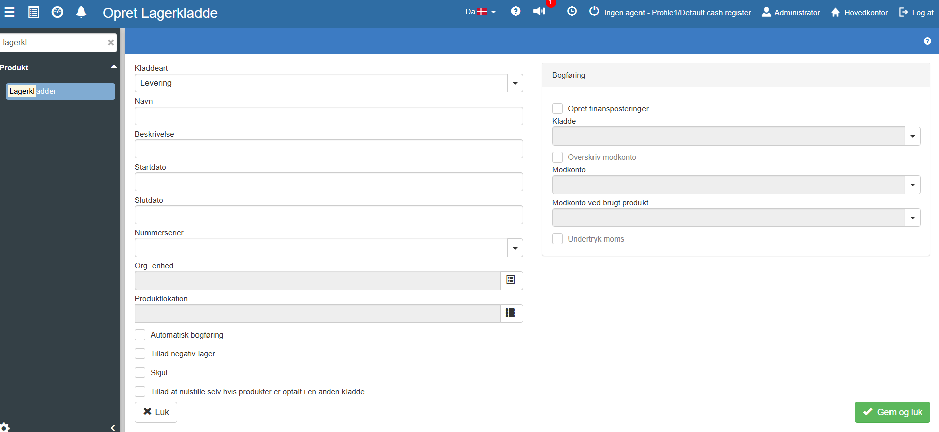 Vinduet "Opret Lagerkladde" åbnes: