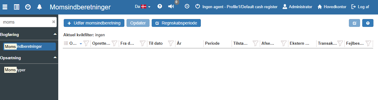 Ønsker du at oprette en ny ordretype, kan dette nemt gøres med et klik på den blå "+ Udfør momsindberetning" knap øverst til venstre: