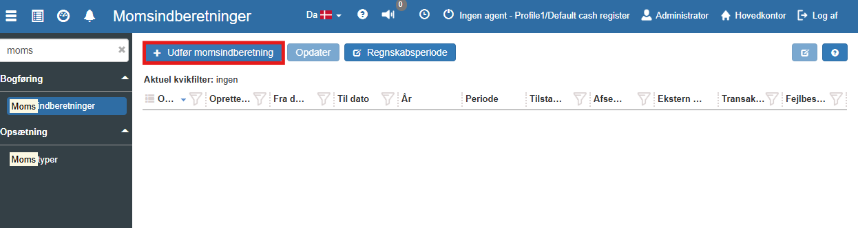 Udfør momsindberetning bruges til at oprette selve momsindberetningen - som ved afslutning sendes direkte til Skat gennem Skats momsapi.