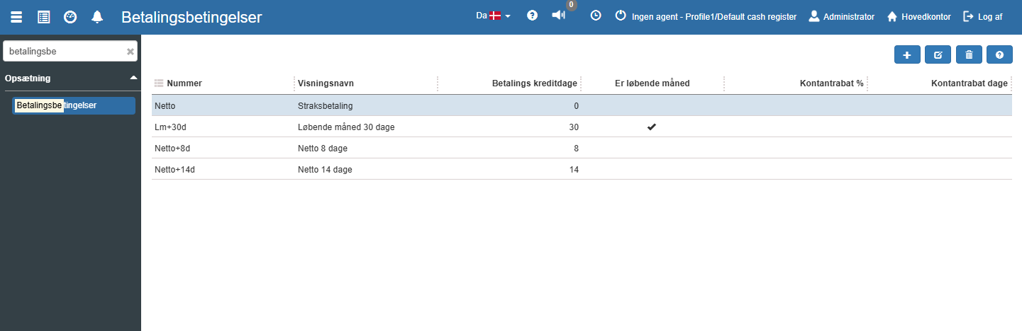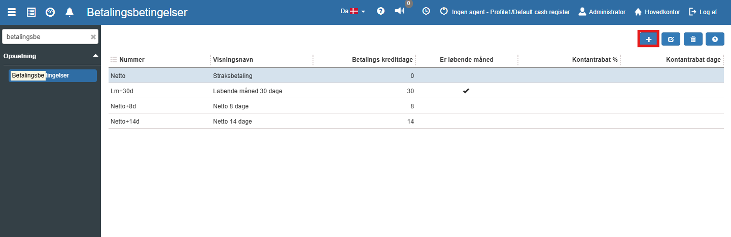 Ønsker du at oprette en ny betalingsbetingelse, kan dette nemt gøres med et klik på det blå "+" ikon øverst til højre: