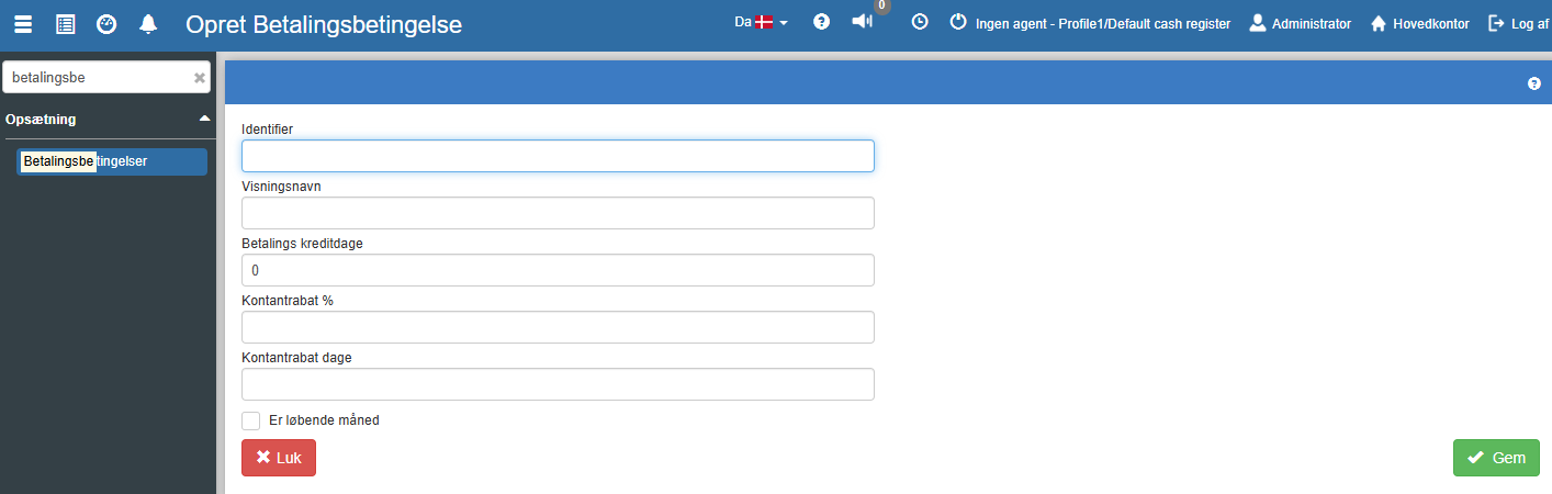 Følgende menu vil nu åbne sig, hvor du har mulighed for at oprette en ny betalingsbetingelse: