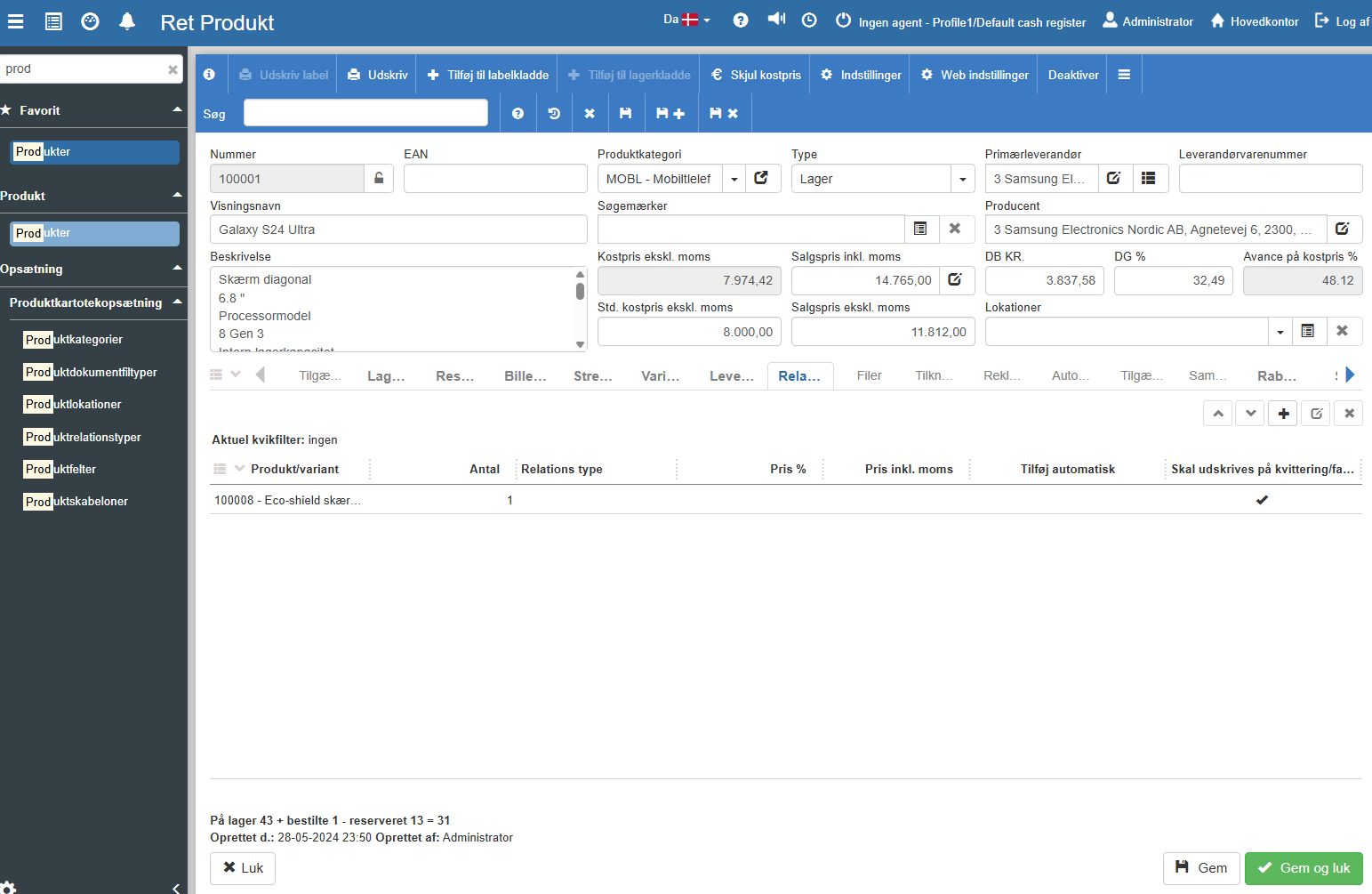 Produkter i Sapera repræsenterer de varer eller tjenester, som en virksomhed tilbyder, administrerer eller sælger. Produktoversigten giver et samlet overblik over alle registrerede produkter i systemet, herunder nøgleoplysninger som produktnummer, navn, kategori, lagerstatus, salgspriser og kostpriser.