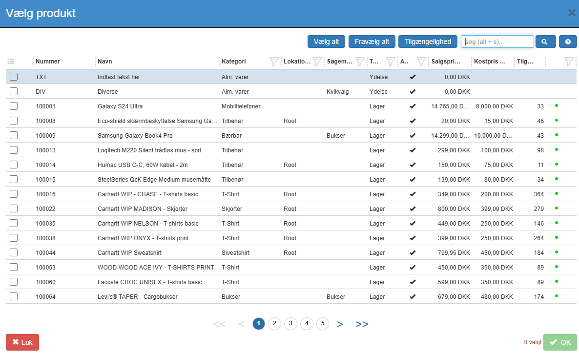 Herefter vises standard søg produkter-dialog. Denne dialog understøtter samme kolonner og filtre som produktoversigten.