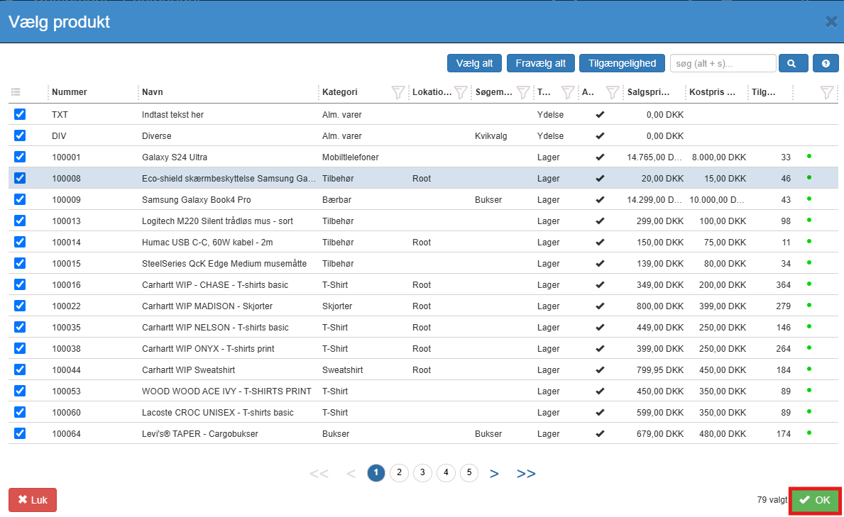 2. Ved tryk på "OK" overføres de valgte produkter til lagerkladden.