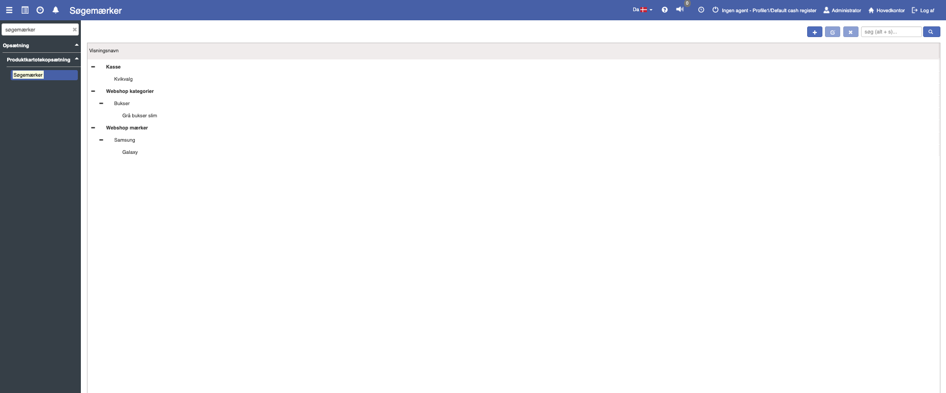 Ønsker du at oprette et nyt søgemærke, kan dette nemt gøres med et klik på det blå "+" ikon øverst til højre.