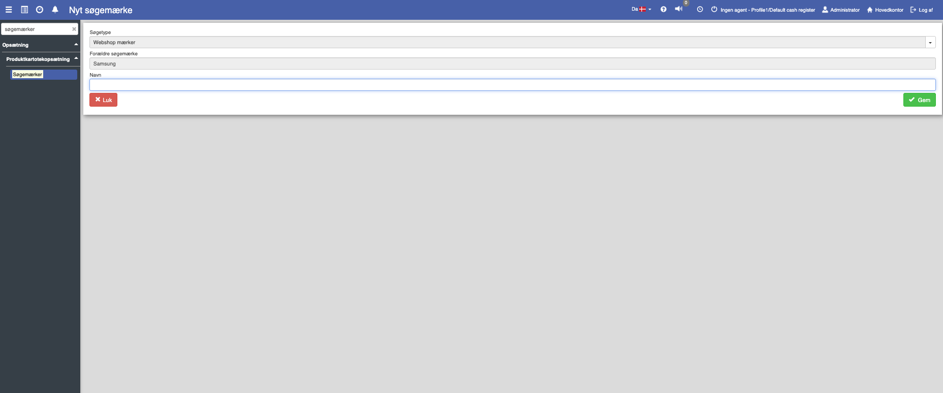 Dette felt bruges til at angive navnet på søgemærket. Navnet skal være beskrivende og let genkendeligt, så det er enkelt at identificere søgemærket under brug eller søgning. Navnet vil være synligt i systemet og kan bruges til at forbinde søgemærket med bestemte produkter, kategorier eller mærker.