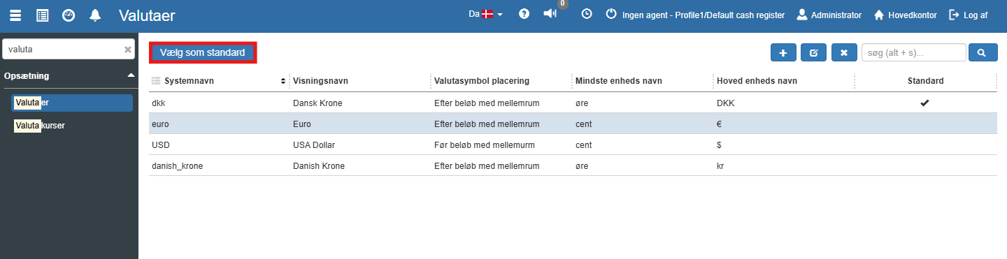 Ønsker du at anvende den nyoprettede valuta som standard kan dette gøres ved at markere boksen "Standard". Alternativt kan du vælge den ønskede valuta og herefter trykke på "Vælg som standard" knappen: