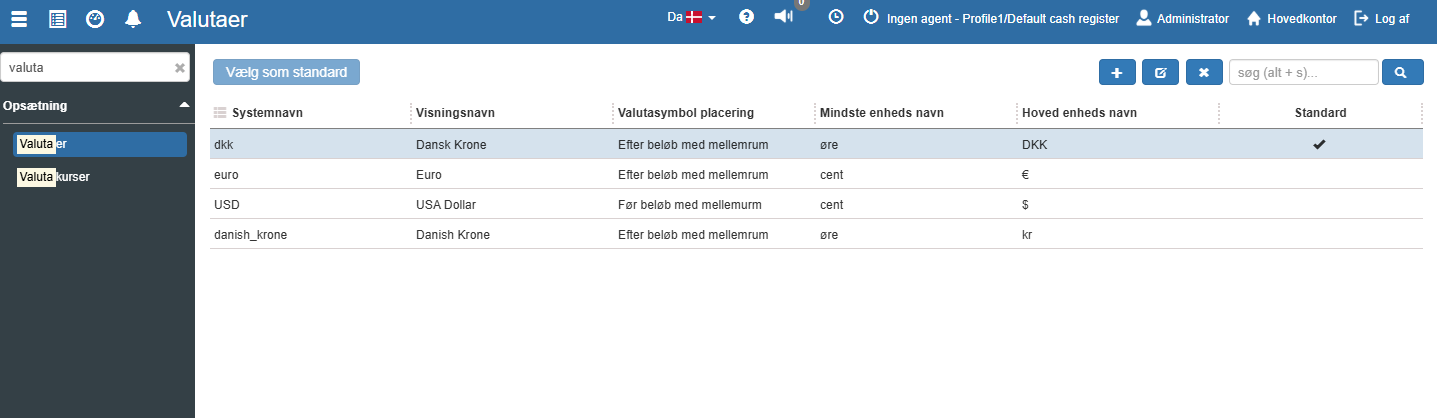 Du har også mulighed for at vælge én valuta som standardvaluta, som vil blive anvendt som hovedvaluta i systemet. Dette gør det lettere at sikre nøjagtighed og konsistens i regnskabsføring og hjælper med at tilpasse sig forskellige markeder, hvor specifikke valutaer og regler gælder.