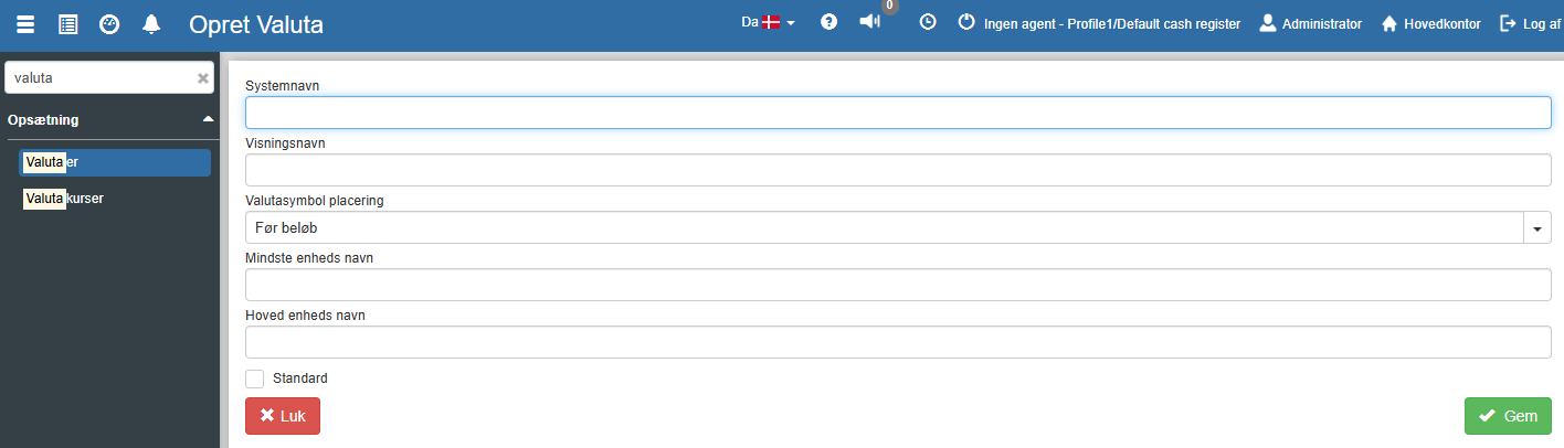 Markeres, hvis denne valuta skal være standardvalutaen i systemet. Standardvalutaen anvendes som udgangspunkt for transaktioner, medmindre andet er angivet.