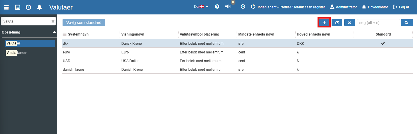 Ønsker du at oprette en ny valuta, kan dette nemt gøres med et klik på det blå "+" ikon øverst til højre: