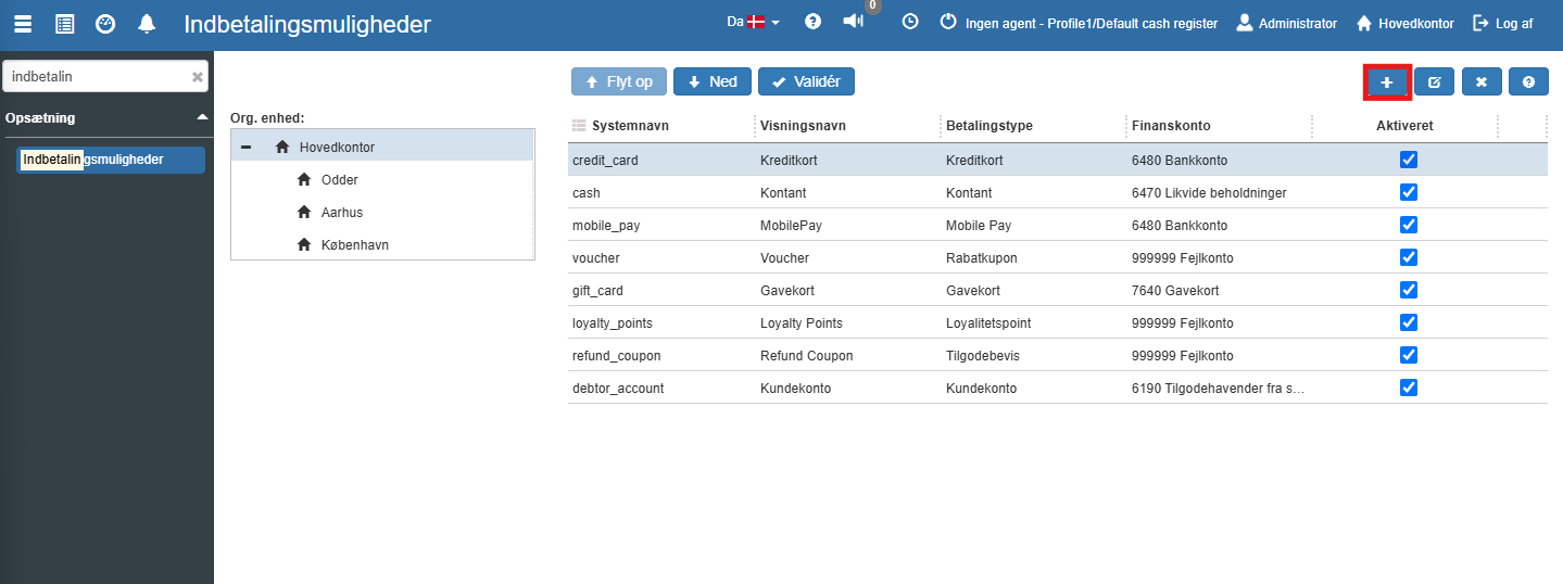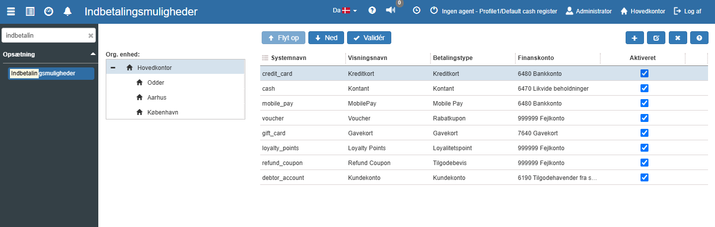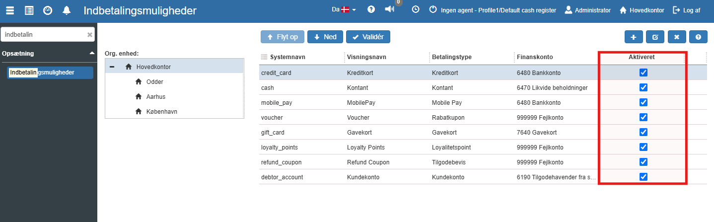 På det nedenstående billede kan du se alle dine oprettede indbetalingsmuligheder. For at aktivere en indbetalingsmulighed skal kolonnen til højre med navnet "Aktiveret" være slået til.