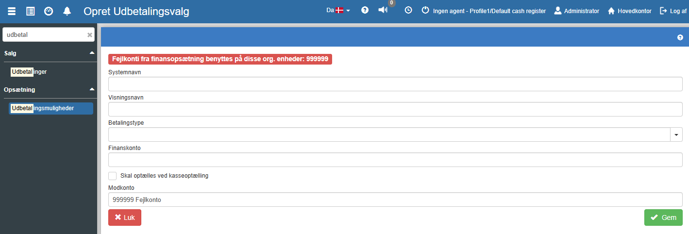 Negativt beløb tilladt: Må der angives et negativt beløb. I så fald vil dette fungere som en indbetaling i stedet for en udbetaling. Dette skal normalt ikke anvendes.