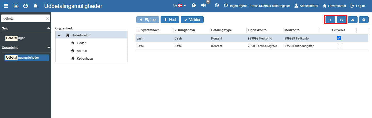 Flyt op: Flytter den markerede udbetalingsmulighed op (de vises i denne rækkefølge ved oprettelse af ny udbetaling fra kassen). Se udbetaling.