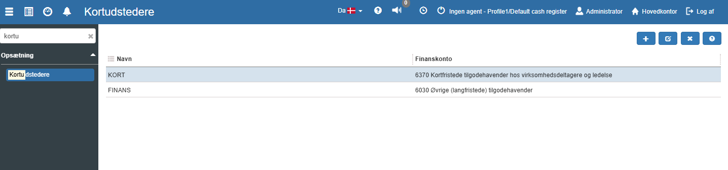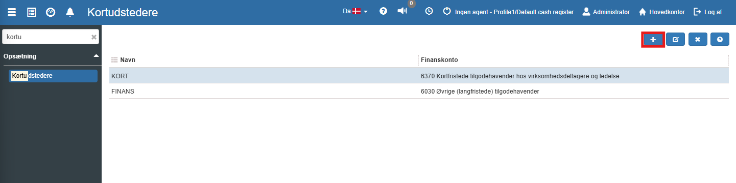 Ønsker du at oprette en ny kortudsteder, kan dette nemt gøres med et klik på den blå "+" knap øverst til højre: