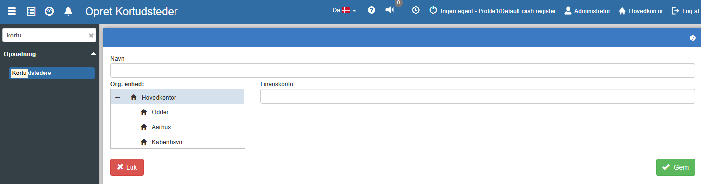Dette felt giver mulighed for at knytte kortudstederen til en specifik organisatorisk enhed i virksomheden. Organisatoriske enheder kan omfatte hovedkontoret og forskellige afdelinger eller lokationer, som fx vist i strukturen: Hovedkontor, Odder, Aarhus, og København.